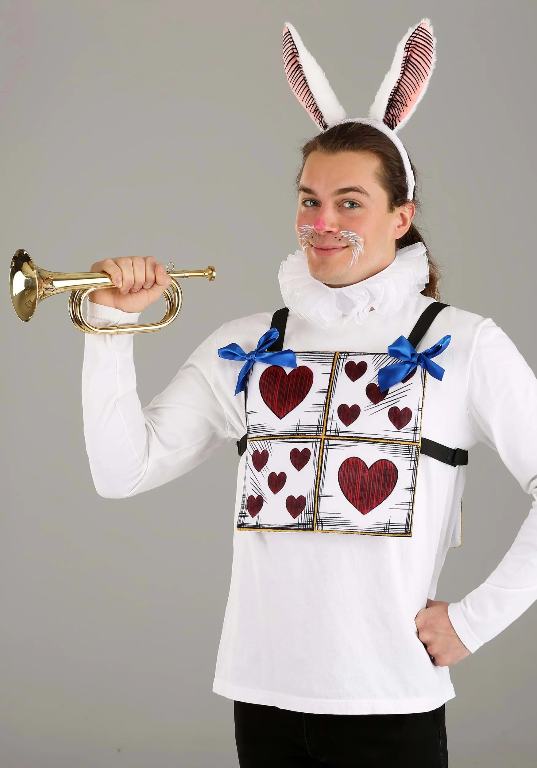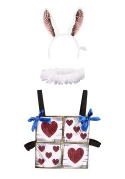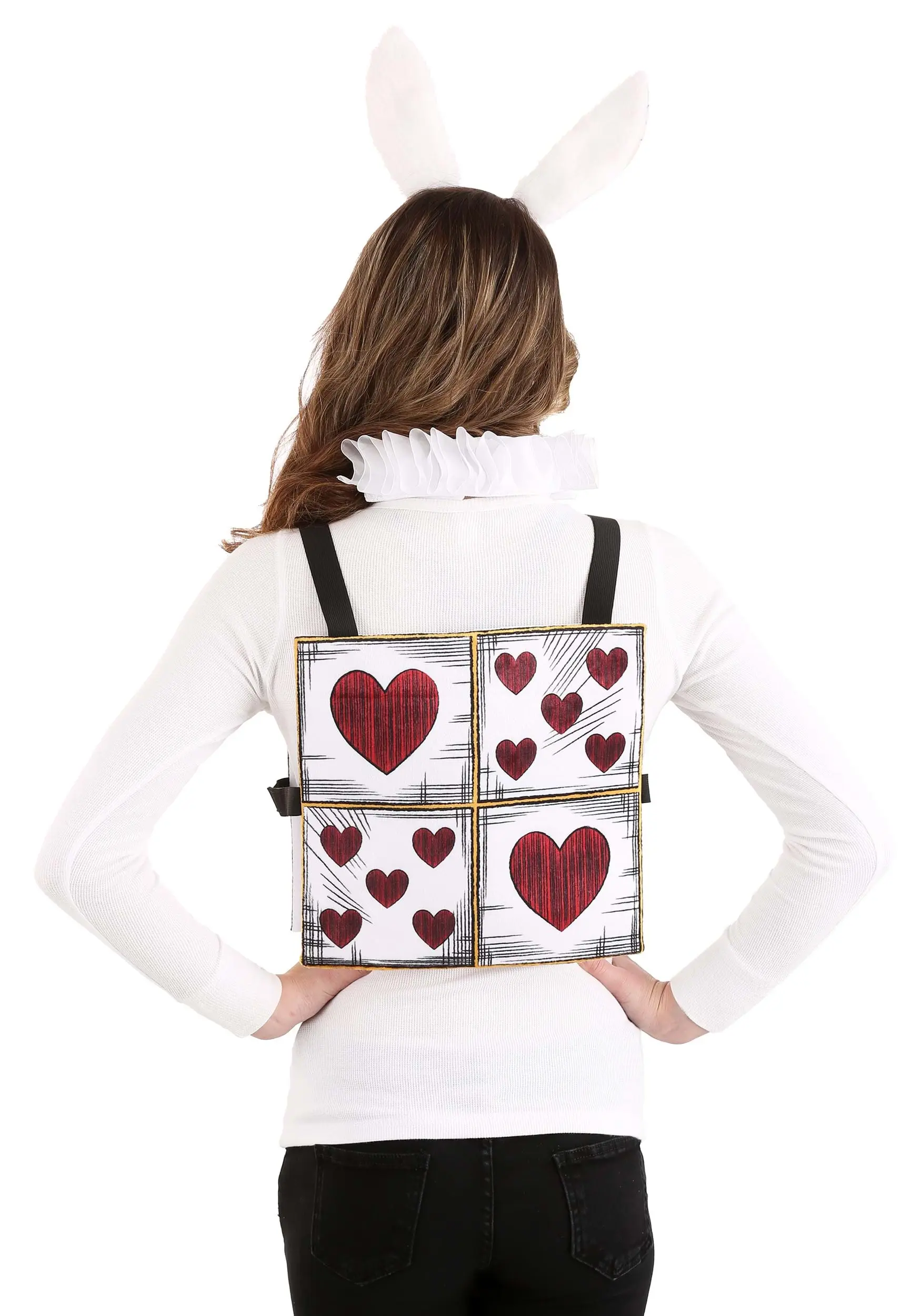 This set will make it easy to transform into the White Rabbit after work or for a middle-of-the-day event. Slip the heart-patterned tabard over a white shirt and secure the elastic straps around your sides with a hook and loop strip. Secondly, slip the elegant ruff collar around your neck. Topped off with adjustable ears with hand-drawn-looking lines on the lining, this White Rabbit set is instantly recognizable by Alice in Wonderland fans!