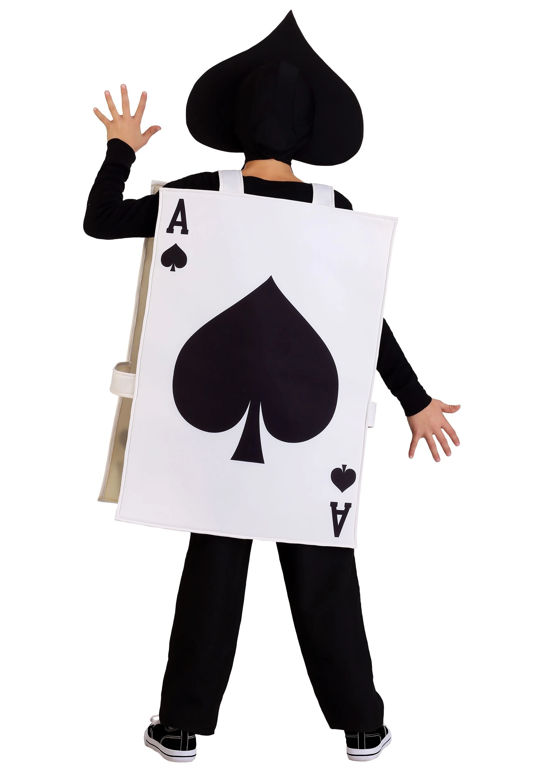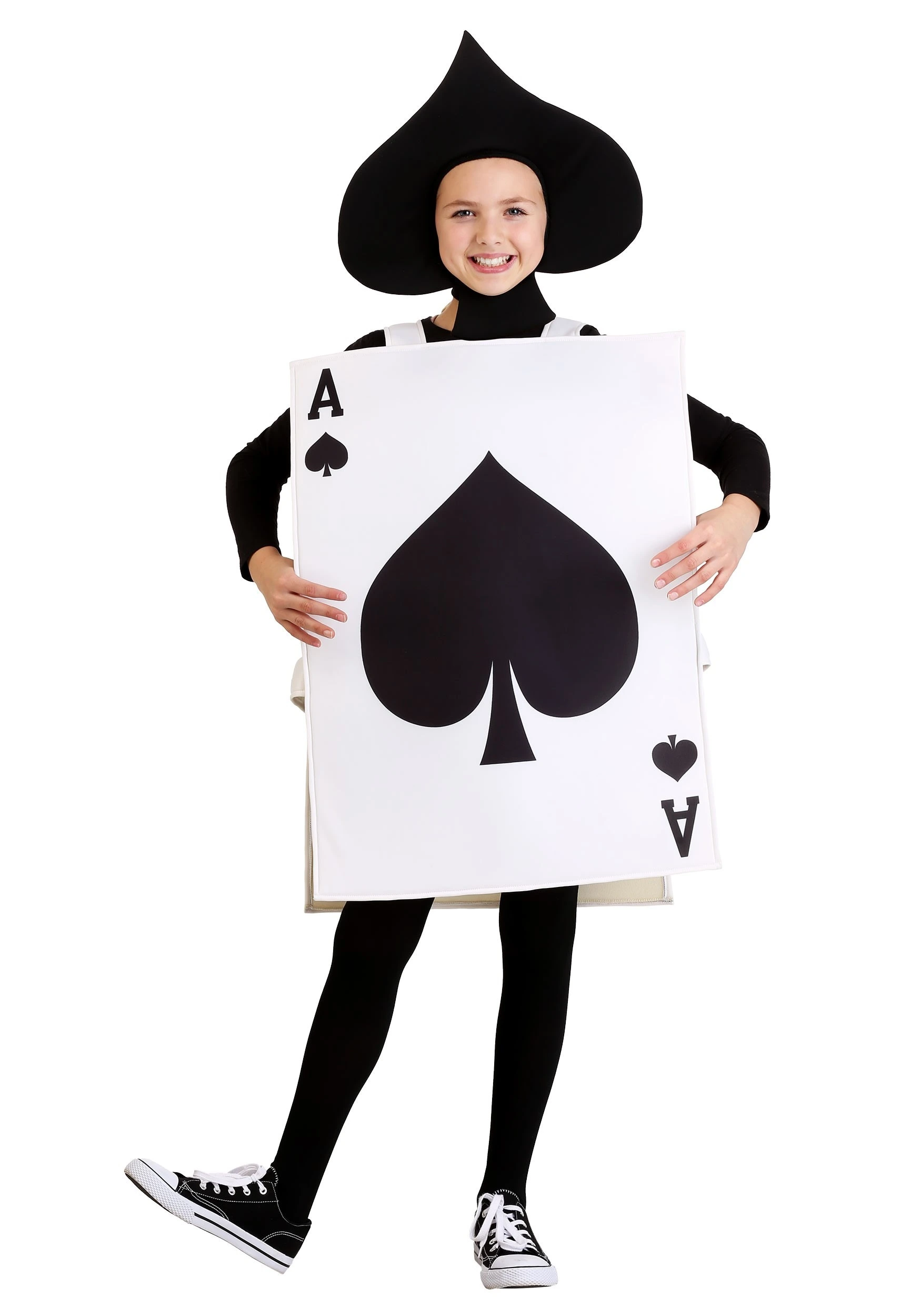 Based on the iconic playing card, this exclusive costume helps make sure that your family always has an Ace up your sleeve. Our costume designers made this simple costume both an easy to wear outfit. It comes with a pullover style tunic that has a rectangular front and back. Both sides feature a giant spade design, along with the signature “A” in the corners. The hood is shaped like a giant spade symbol.