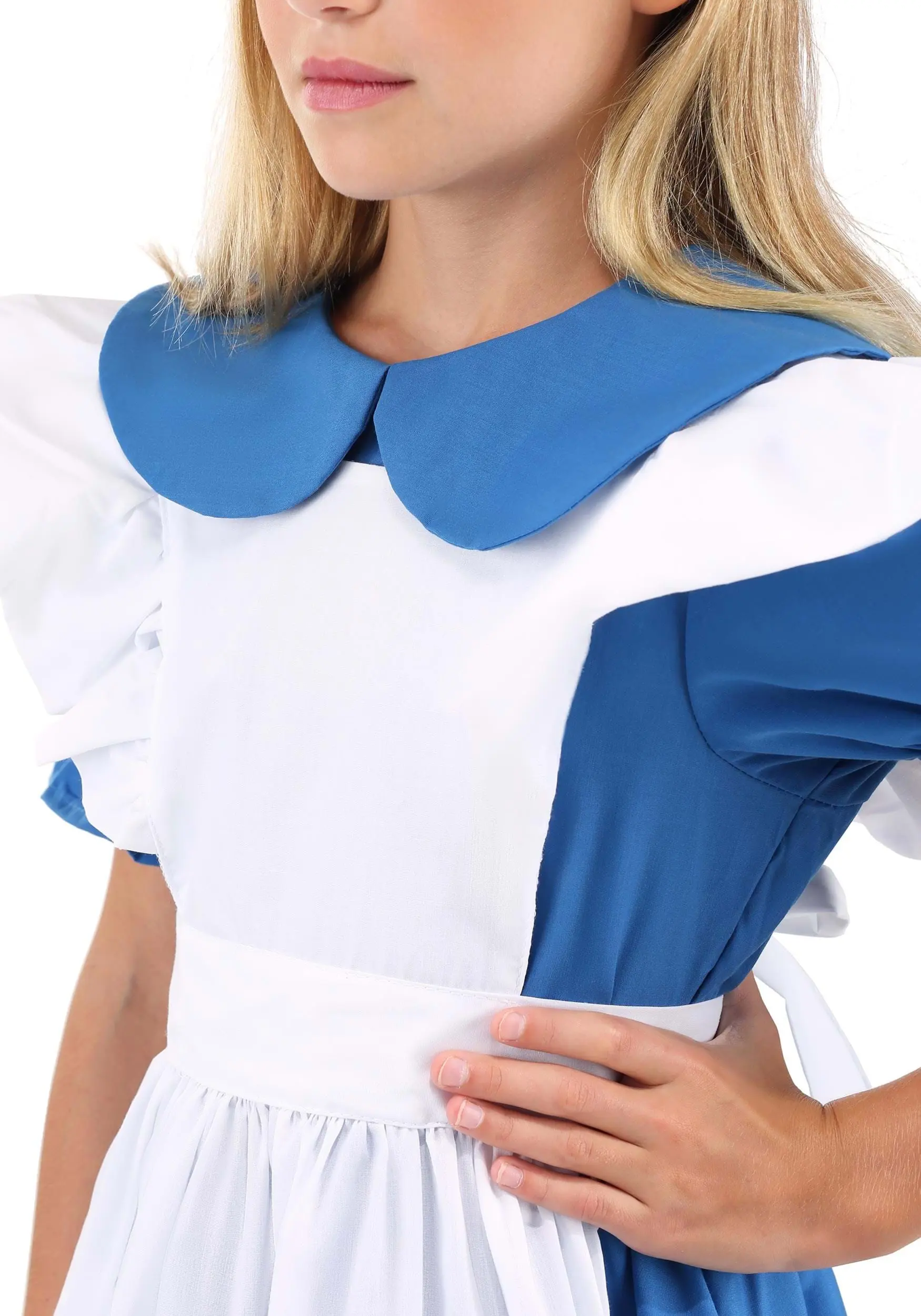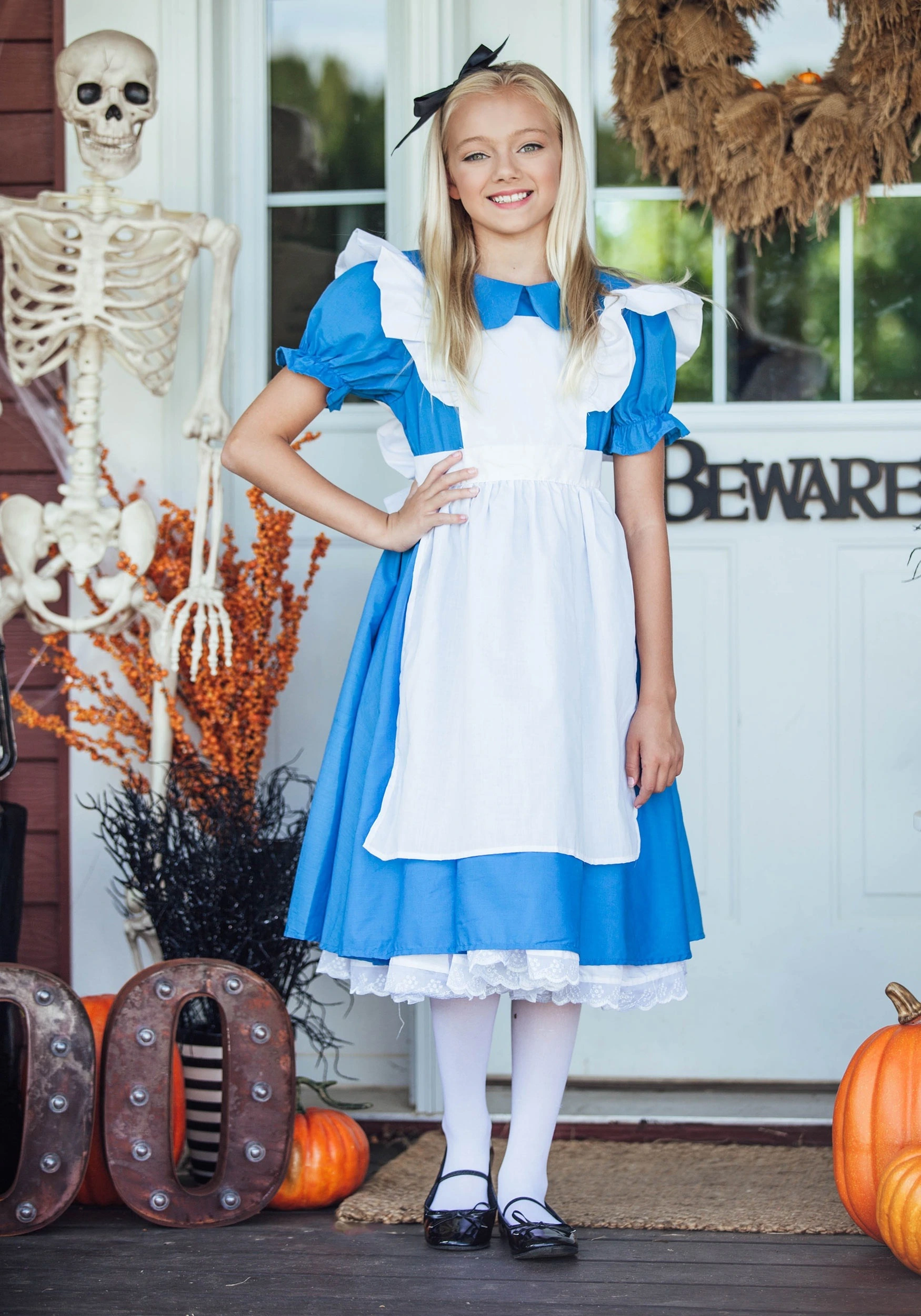 You won’t have to deal with any nonsense when you pick up this HalloweenCostumes.com exclusive costume for girls. It captures the classic Alice look, and with top-notch material and construction, you can be sure that she’ll have a timeless style for this Halloween. This deluxe Halloween costume comes with a blue dress that has buttons at center back for easy on and off and features puffed short sleeves with elastic cuffs for added detail. For added fullness, the dress also features a sewn-in petticoat that’s edged with ruffled eyelets. A white pinafore apron that has ruffled shoulder straps ties at the waist to give it the full Alice look. Finish off your costume with the included black satin hair ribbon that can be tied however best fits your child’s hair. Check out all of our accessories to get her ready for a trip of her own to Wonderland, including black shoes, white tights, and a clock purse!