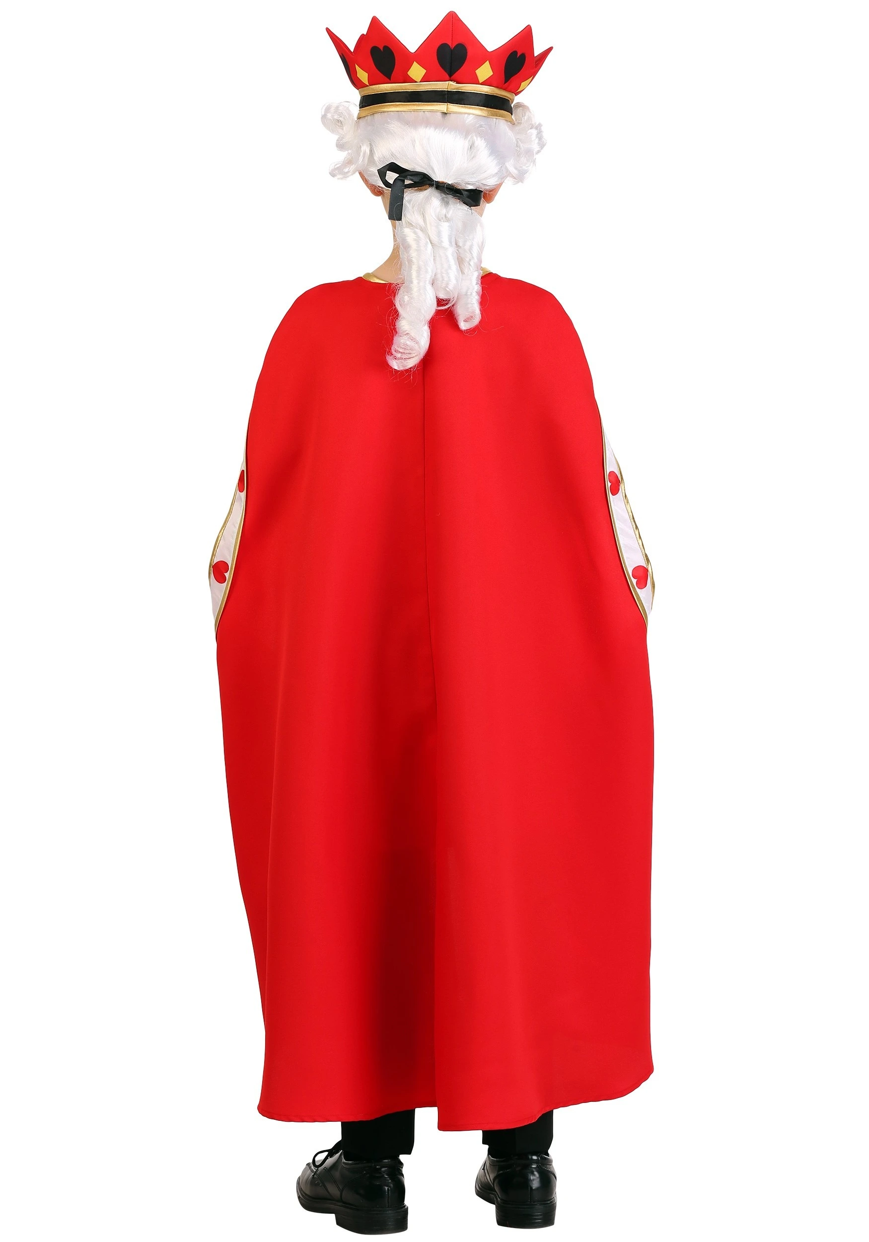 Crafted by our costume designers, this exclusive King of Hearts Costume is a kid-sized outfit that packs plenty of regal details. The robe is bright red with a card suit inspired pattern in front that features hearts an diamonds, and spades. The tunic has heart and diamond patterns on the front, along with gold piping along the hemline. The crown really makes your child look like a regent! The bright red color matches the robe and it has black hearts and gold diamonds printed around its circumference. It’s a look that will make all of the card soldiers stand in line, waiting for their orders!