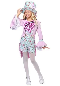 Now, your daughter can show off the long lost prettier side of the Mad Hatter in this gorgeous French inspired ensemble. The modern and sophisticated look has a ruffled white shirt that is tucked into a high-waisted blue short with a slight sheen and dainty flowers. The costume has plenty of flair with a pink jacket with tails, a gold chain, and ruffled bell sleeves. The costume is polished off with a colorful bow tie and a beautiful flowered top hat with an over-sized pink bow, a hat that any Hatter could be proud of.