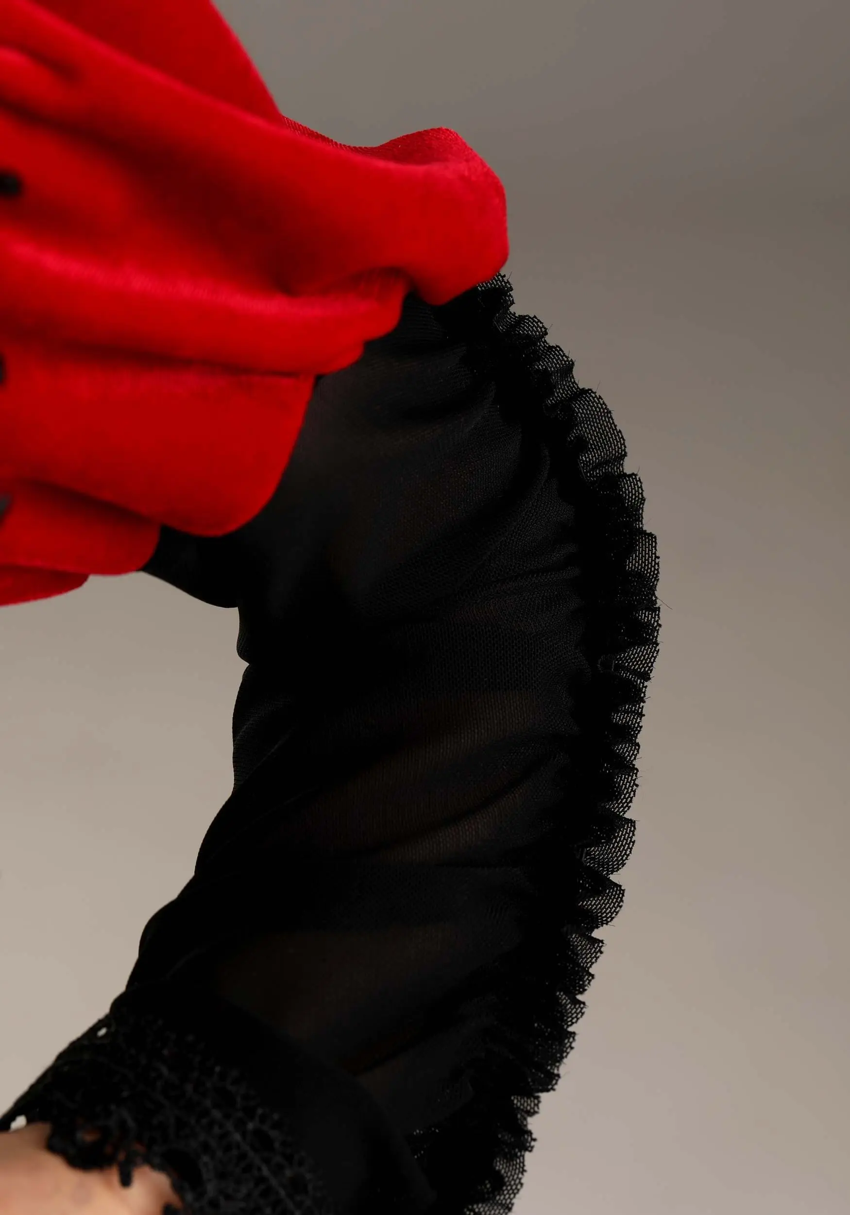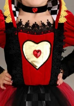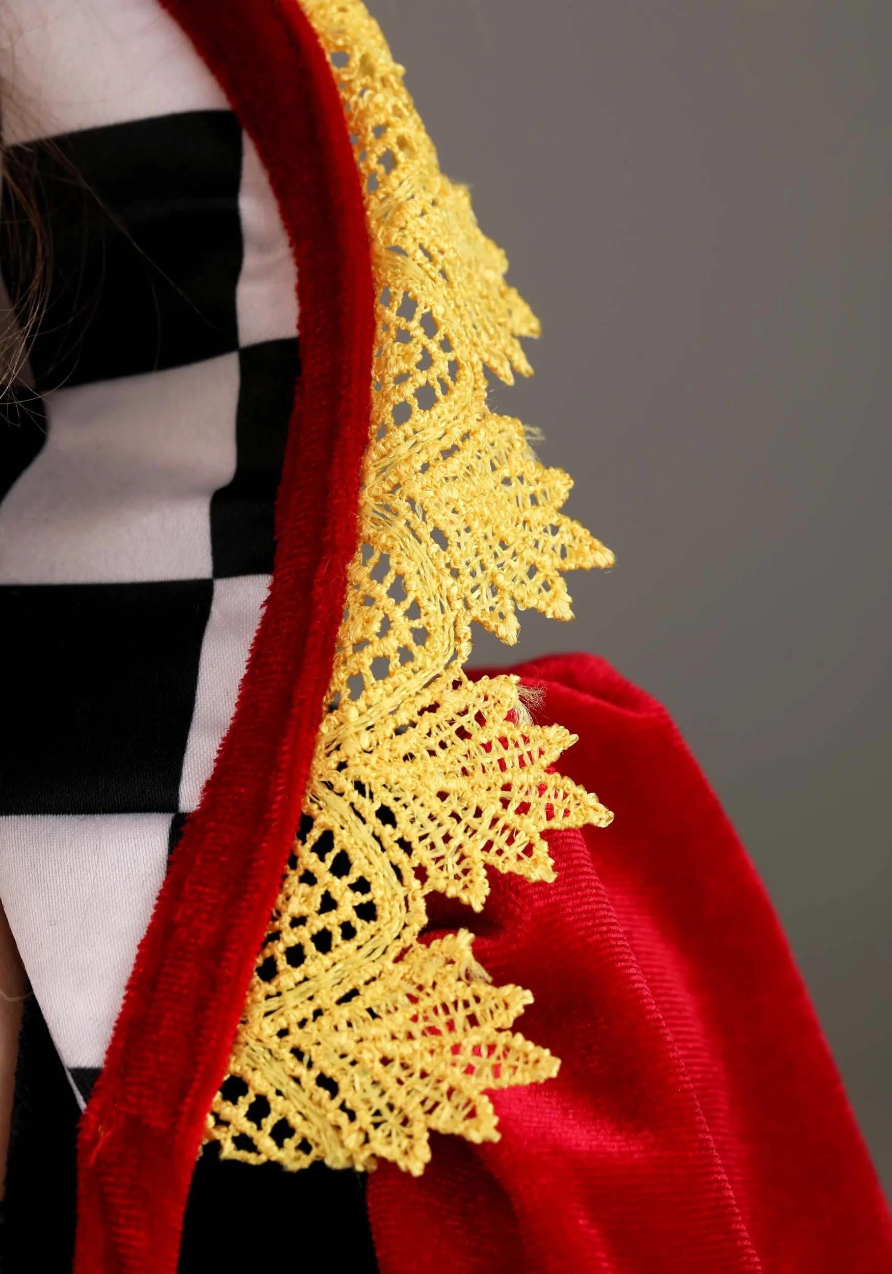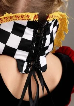A checkered satin skirt with golden yellow trim is layered under black and red tulle that provides volume. For more volume, an included hoop skirt can be worn under the dress. Black and red velvet shape the leg o’ mutton-sleeved bodice decorated with lace trims and a gold heart applique on the chest panel. The high collar is secured with a laced back and can be opened for easy dressing. An included choker and crown headband mark your toddler ruler of playtime!