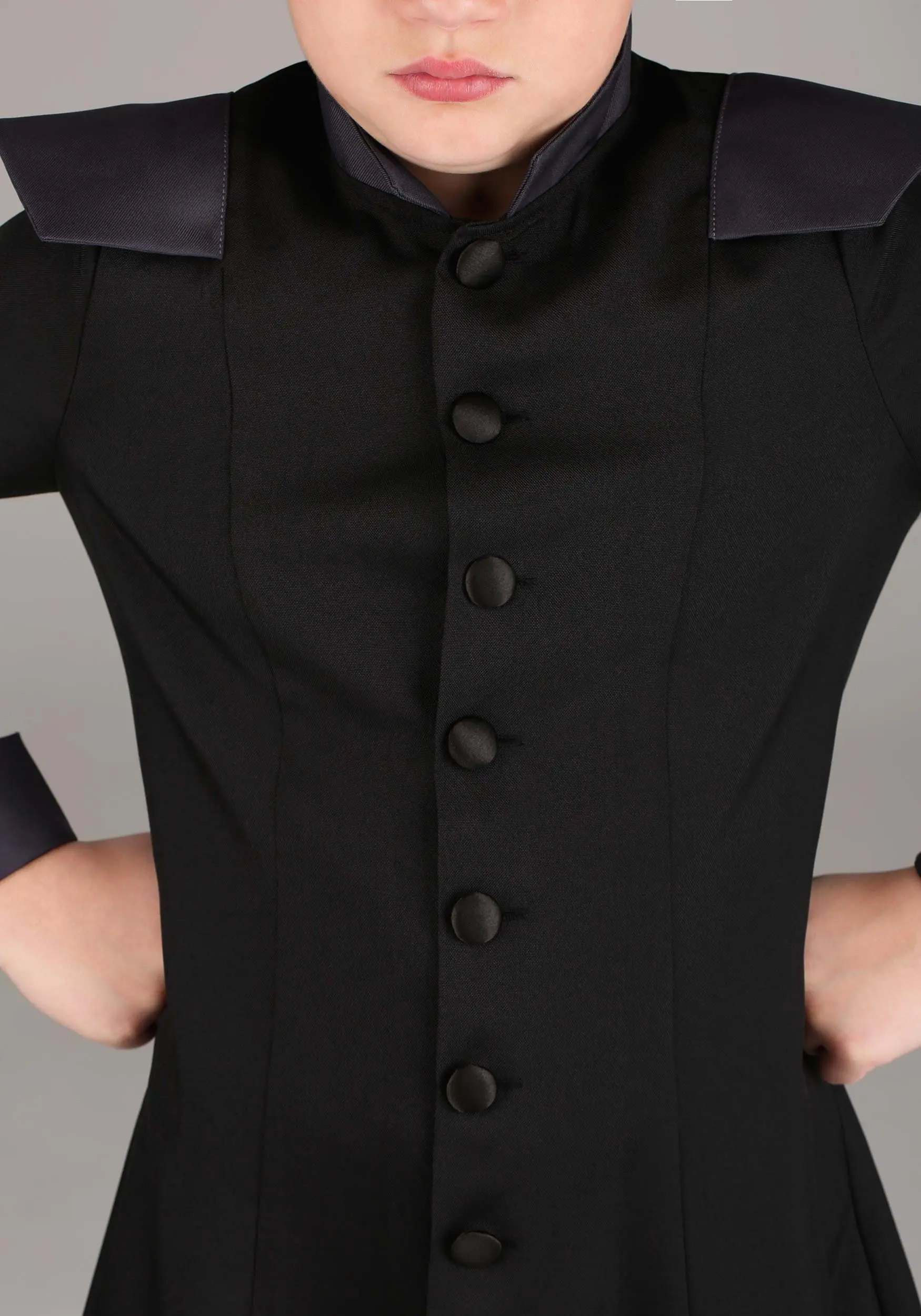 - Satin-covered buttons at center front