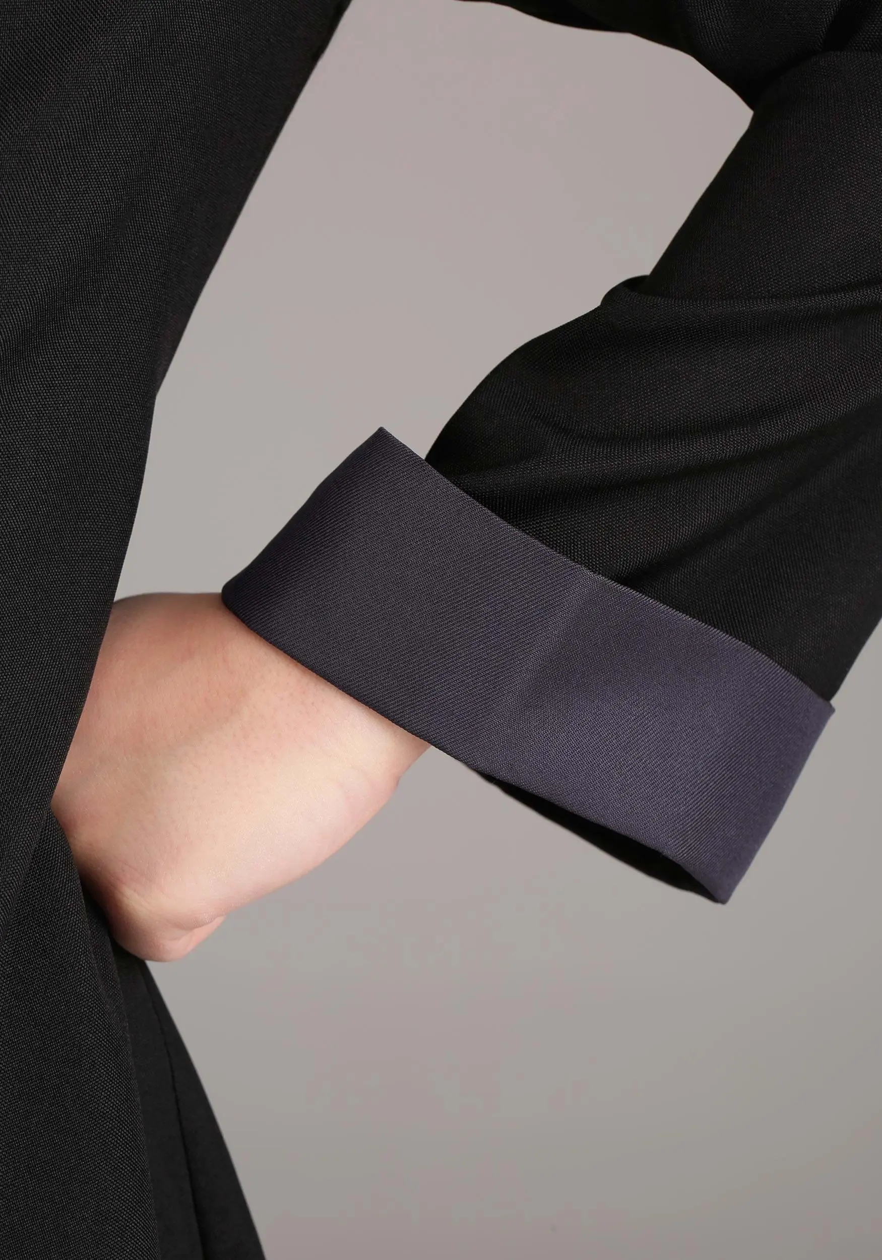 - Contrasting-color mandarin collar, shoulder caps, & sleeve cuffs