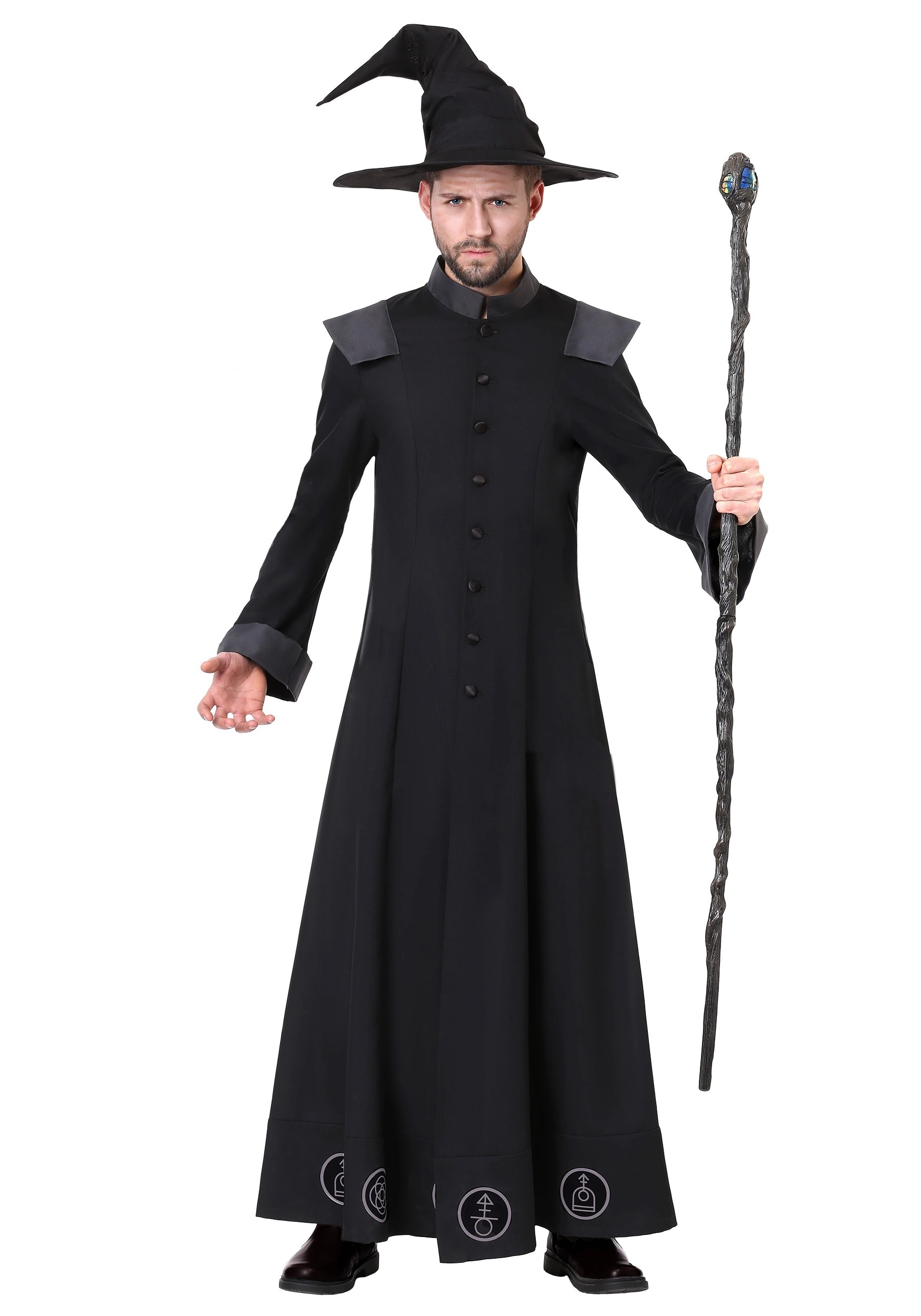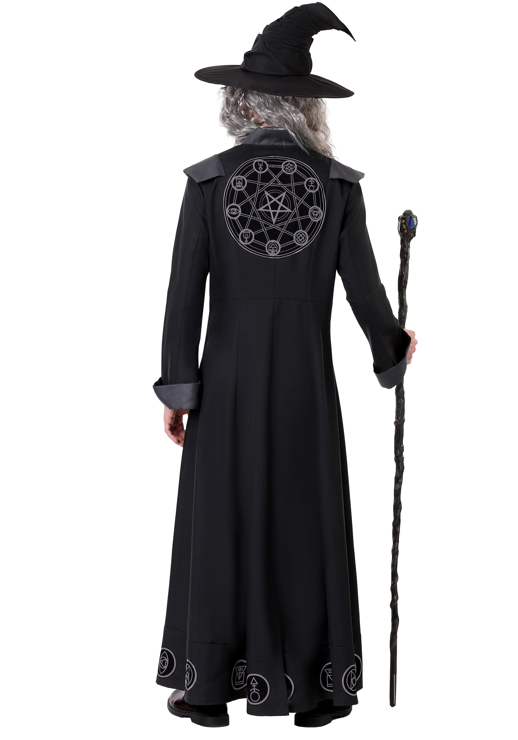 Made right here in our costume studios, this style will make for a real Halloween treat. Styled as a jacket and hat costume combination, it’s full of extra design details. The heavyweight canvas jacket secures in the front with buttons and features a matte collar, sleeve cuffs, and epaulet style shoulder covers. The hemline features patches that depict pagan style symbols, and the back of the jacket features a very large printed design. The costume also comes with a pointed hat, and you can add a staff like we have pictured for extra effect (staff sold separately).