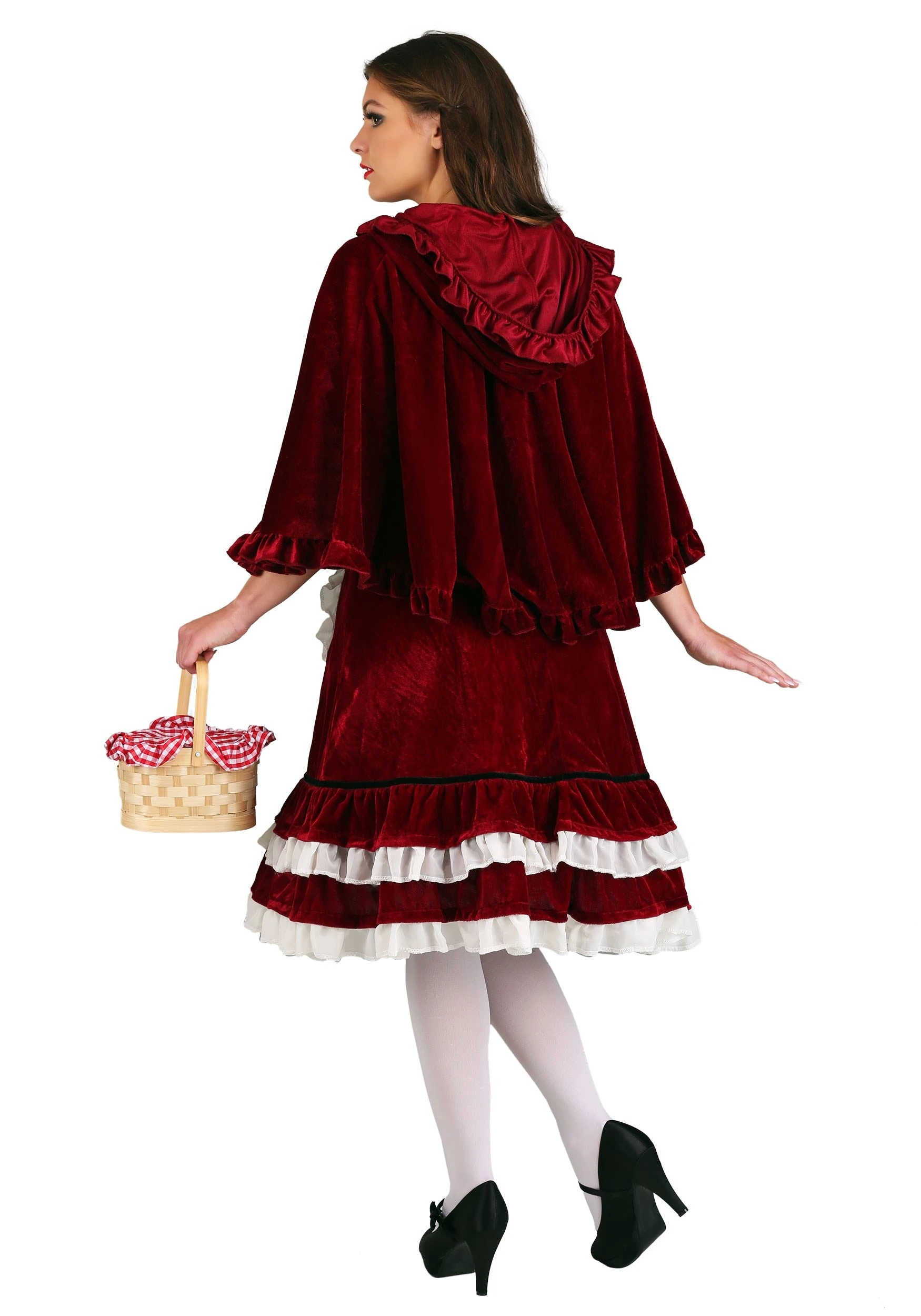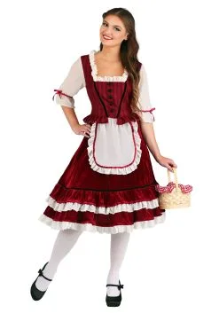 This delightfully timeless costume was designed by our in-house creative team. Standing out with exceptional detail and quality, this is a costume that can be worn again and again for different events. A knee-length velvet skirt with ruffled tiers hangs in a twirlable circle skirt from a subtly striped bodice. Sheer elbow-length sleeves and a natural ruffle create an old-fashioned feel. The costume is completed with a hooded capelet, hooked at the neck. Perfect for your next themed party, this costume can be completed with a basket and white stockings to seem as if it’s come straight out of a fairy tale!