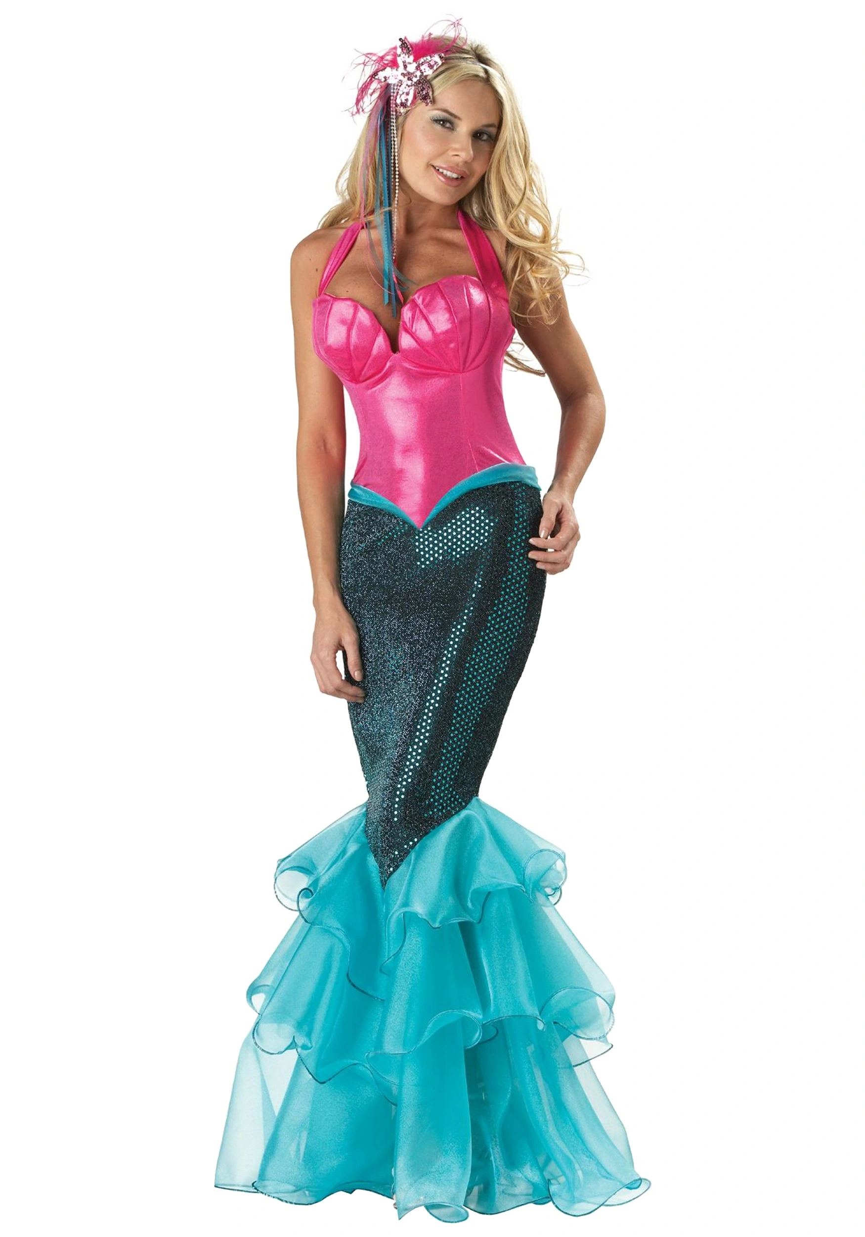 Embrace your taste for the undersea lifestyle in this nylon/polyester blend mermaid costume, featuring a pink halter top with back zipper and foam sea shells at the bust. The green sequin skirt tails off into elegant green mesh fins, with a sequin starfish headpiece as the crowning touch. Some mermaids may dream about being part of our world, but this ensemble makes a clear statement that you’re rather fond of your own.