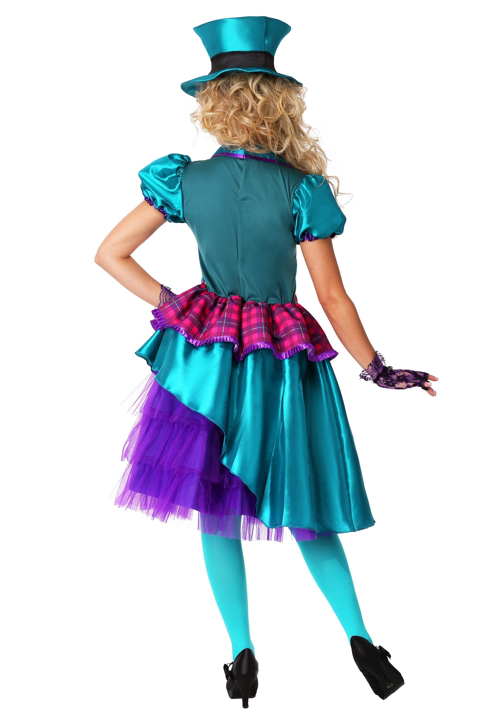 The women’s teal mad hatter is an exclusive Made by Us design, meaning it’s a high-quality costume that can be worn multiple times like a real garment. The pullover dress has hook and loop fasteners in the back with an attached felt pocket watch and 3 faux buttons. Ladies who love color will adore the funky teal, purple, and pink color scheme. The included bow tie fastens to dress with hook and loop fasteners while the top hat features the signature 10/6 detail. Please note, gloves, tights, and shoes are NOT included.Â