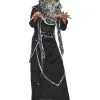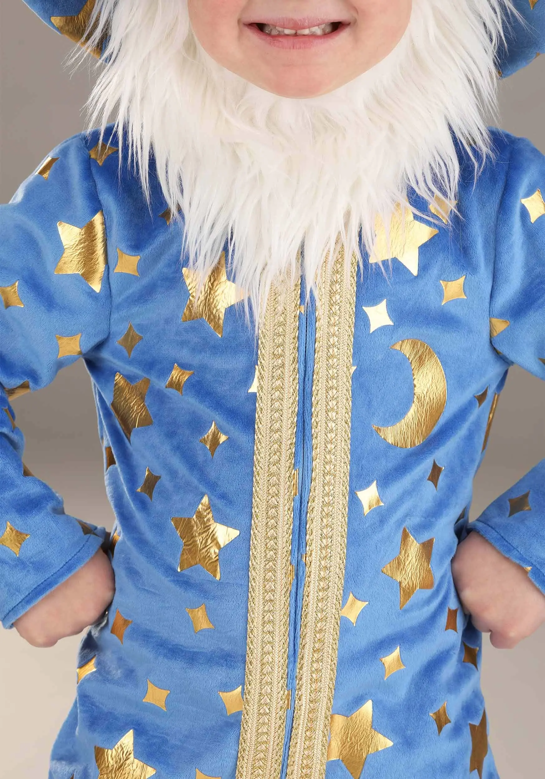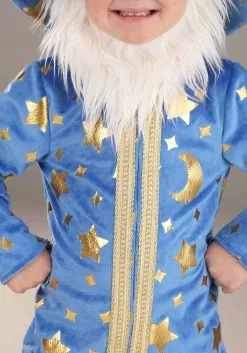 Make your child’s Halloween magical by dressing him in this exclusive Li’l Wizard Costume for Toddlers! The blue polyester velour robe is approximately ankle-length and zips up the front via a zipper concealed with a column of gold braid. The robe is spangled all over with a pattern of printed metallic gold stars and moons. The pointed, foam-backed wizard hat is made of matching metallic-printed velour and has a wide, slightly floppy brim. The white faux fur beard attaches to the underside of the hat brim via a plastic snap sewn to each side.Â