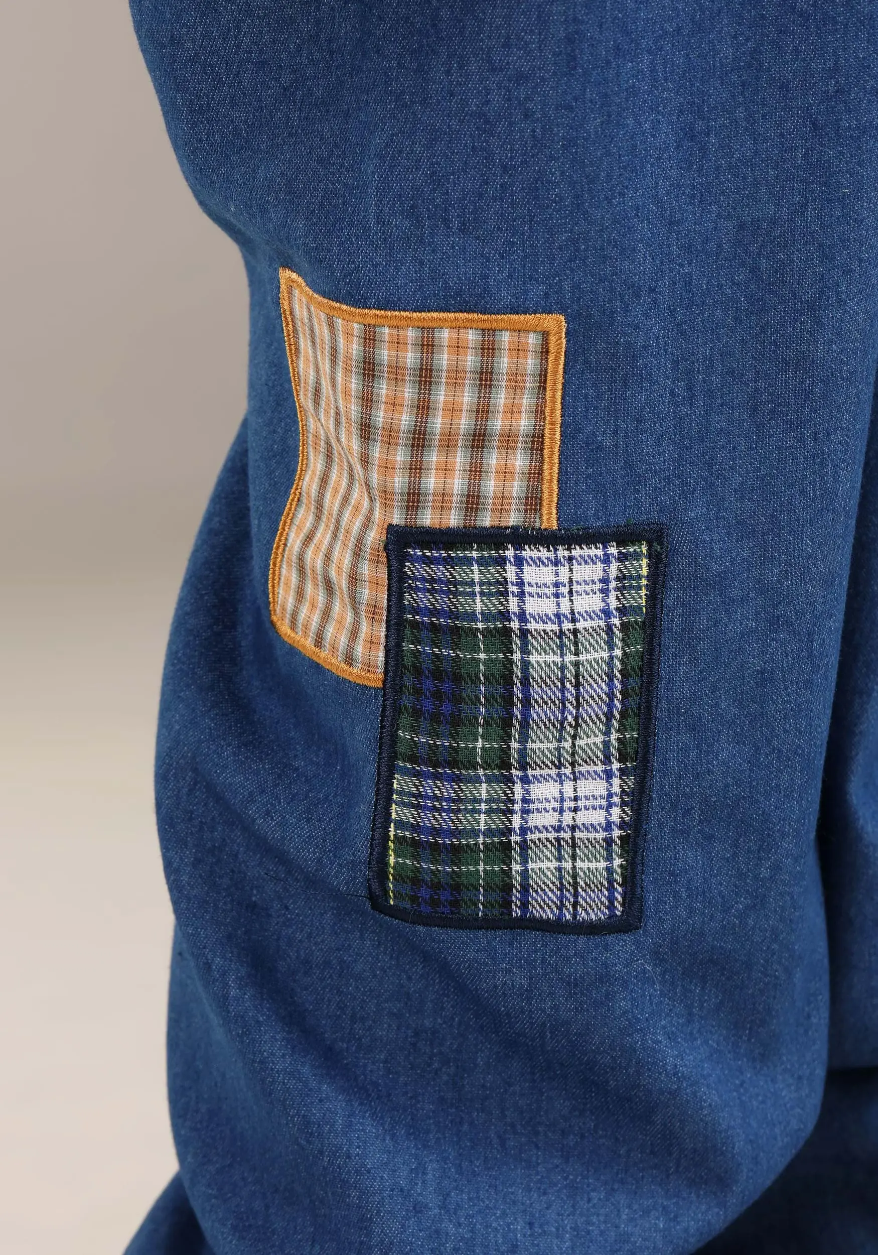 - Pants have appliqued patches, ribbon trim, fabric fringe at cuffs
