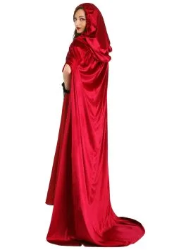 This dramatic cloak has beautiful, theatrical draping. The hood cinches around the head and can be tied with a wide, glossy ribbon. The long red, shining material has a slit in the sides to let your hands gesture freely while your arms staying in the cloak. Long and draping, this cloak is sure to make a dramatic entrance to any event!