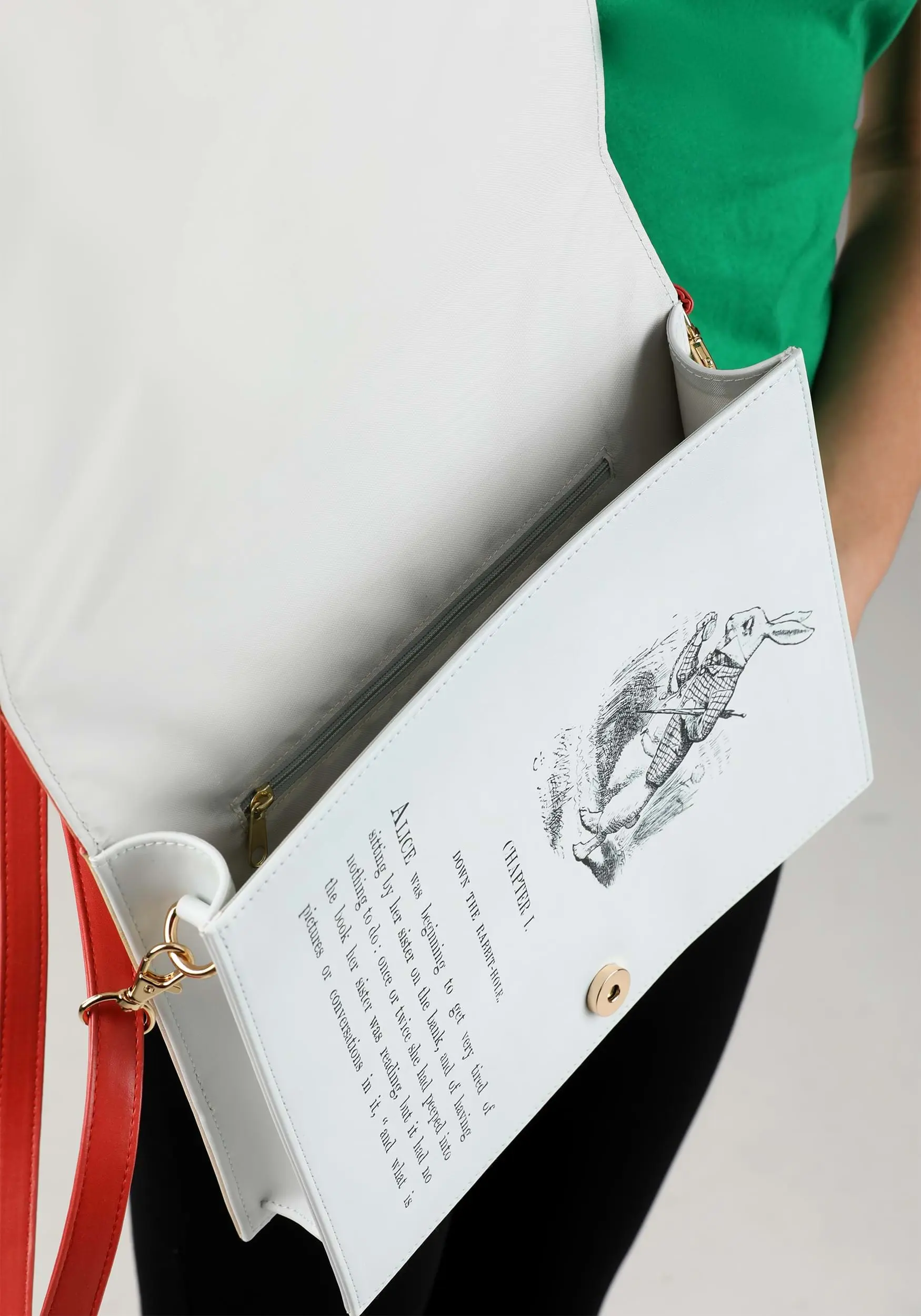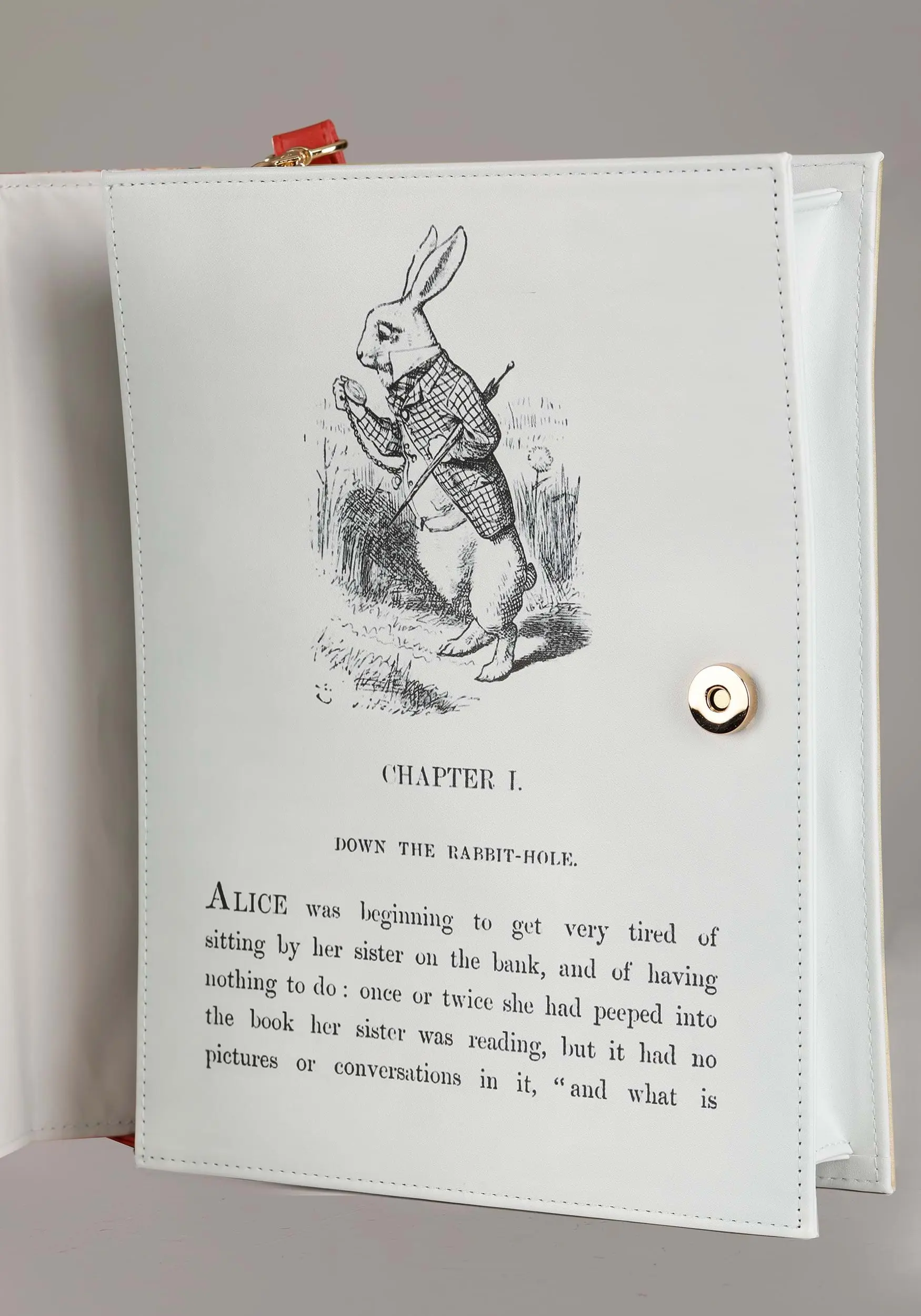 Fall down the rabbit hole to a fashion wonderland when you carry this Alice in Wonderland Book Purse! The rectangular bag is printed with a vintage cover of Lewis Carroll’s most famous work and comes with an adjustable red crossbody strap. Unfasten the purse flap’s magnetic clasp to reveal a printed image of the book’s first page!