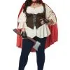 Live your own fairy tale when you wear this Plus Size Little Red Costume for Women! The outfit includes a sleeveless crop top that fastens up the back and features a gorgeous bustier design complete with white lace details, criss-crossed black ribbon, and a crimson bow. The matching mini skirt has a solid red bottom layer and a top layer made of lace-trimmed mesh. A mini apron is attached to the front. Black gloves encase your hands and the red mesh cape ties around your neck with a red ribbon.